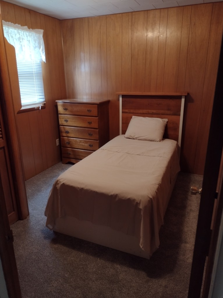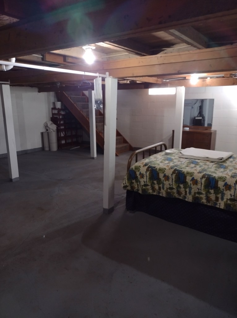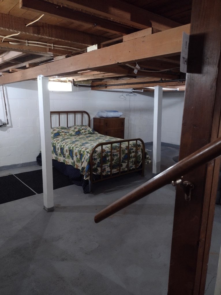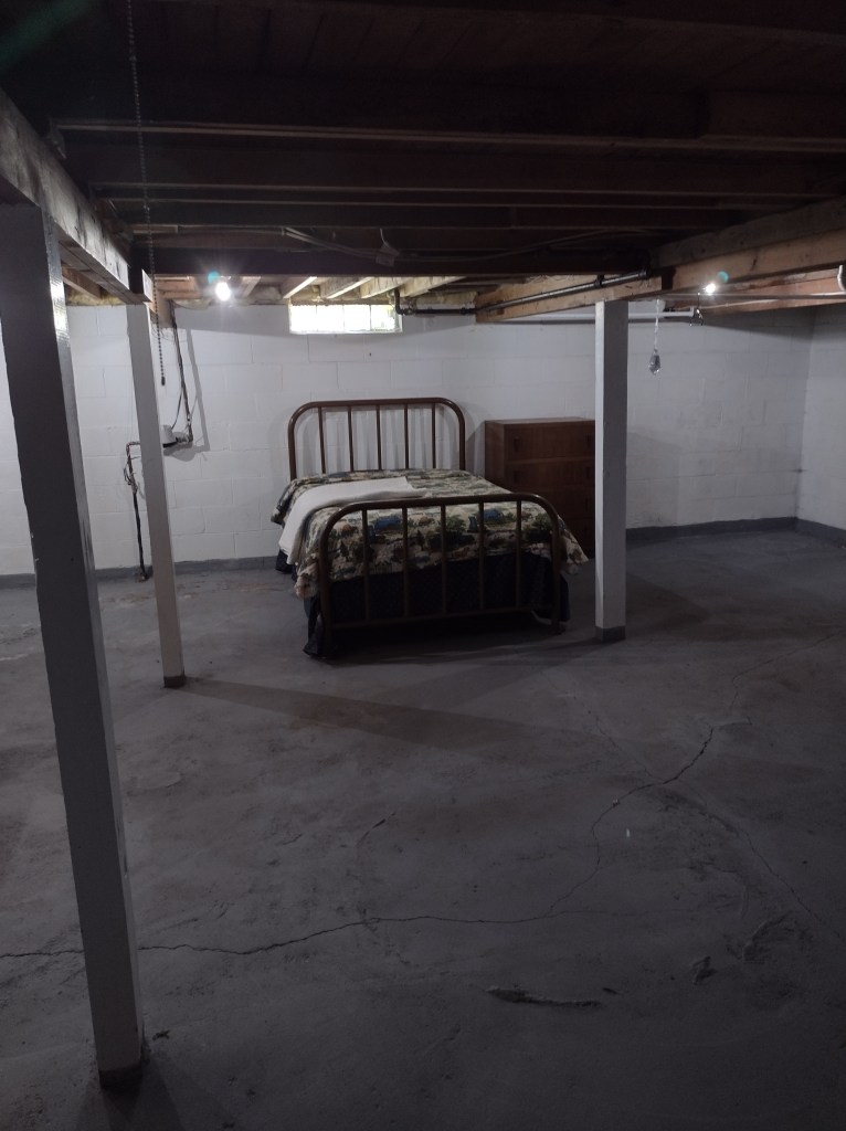 The basement is not fully furnished, it has an open floor plan for the length and width of the house, with some natural light. It has an antique double-size bed, dresser, and chest of drawers. The basement also has a clothes washer and dryer.